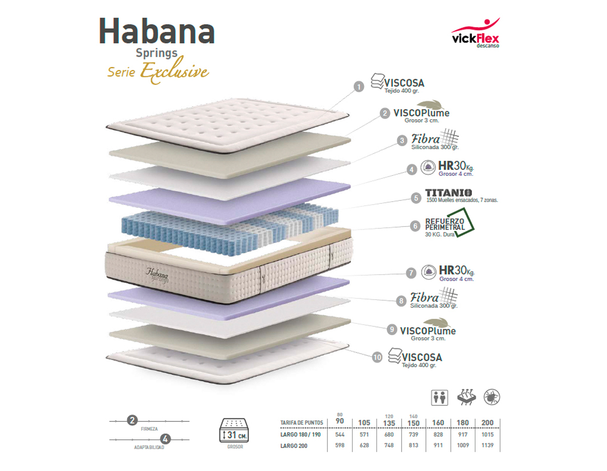 •Composición. TEJIDO VISCOSA (400 gm)+ VISCOPLUME + FIBRA SILICONADA + HR 30 Kg.+ CARCASA MUELLES ENSAC. TITANIO (7 ZONAS DESCANSO)+ REFUERZO PERIMETRAL.