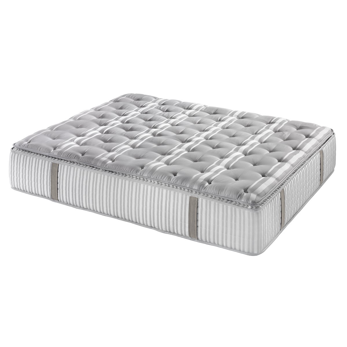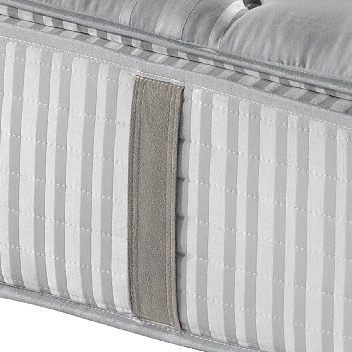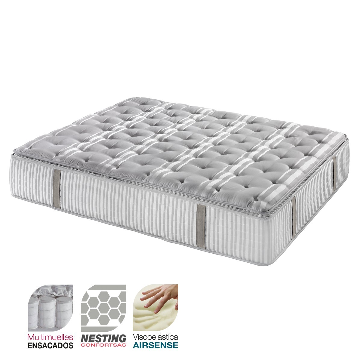 La platabanda presenta 8 asas para facilitar los movimientos de giro. Tapa superior confeccionada con cosido de salto que realza las capas de relleno del topper y cara inferior acolchada en continuo.