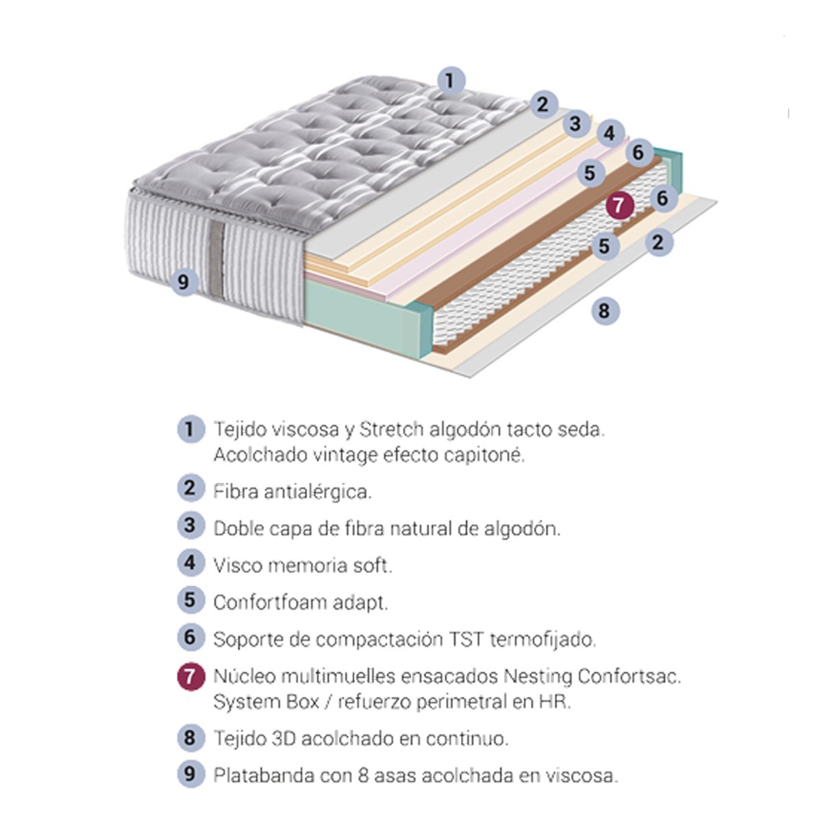 La combinación de los multimuelles ensacados, topper con 4 cm de visco memoria soft cosido en la cara superior y un refuerzo perimetral SISTEM BOX con bloques de HR, proporcionan en el colchón VANITY el confort más independiente.